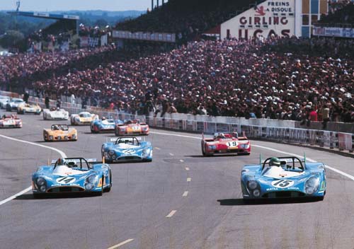 Pg. 288 Led by the three Matra 670s and a long tail Alfa Romeo 33/3, the field for the 24 Hours of Le Mans pulls away on the pace lap.
