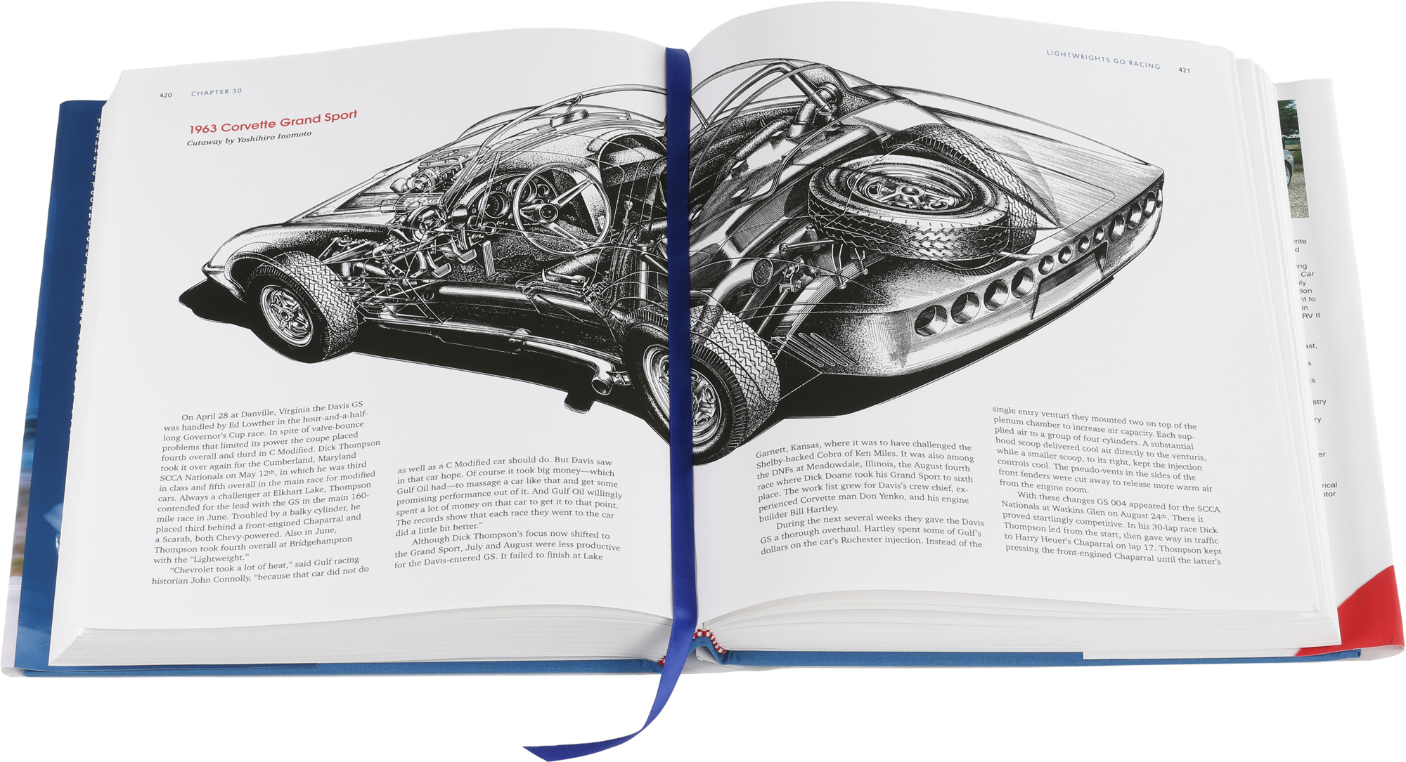 Frustrated by GM's adherence to the Automobile Manufacturers Association's 1957 ban on corporate support for automotive racing, to the detriment of the nascent Grand Sport Corvette, Zora Arkus-Duntov arranged for the five prototypes that had already been built to be made available to carefully selected race teams. Chapter 30: Lightweights Go Racing tells the story of the technical challenges these prototypes faced in their first racing season, with racing and technical illustrations like this cutaway of a 1963 Corvette Grand Sport by legendary automotive artist Yoshihiro Inomoto.